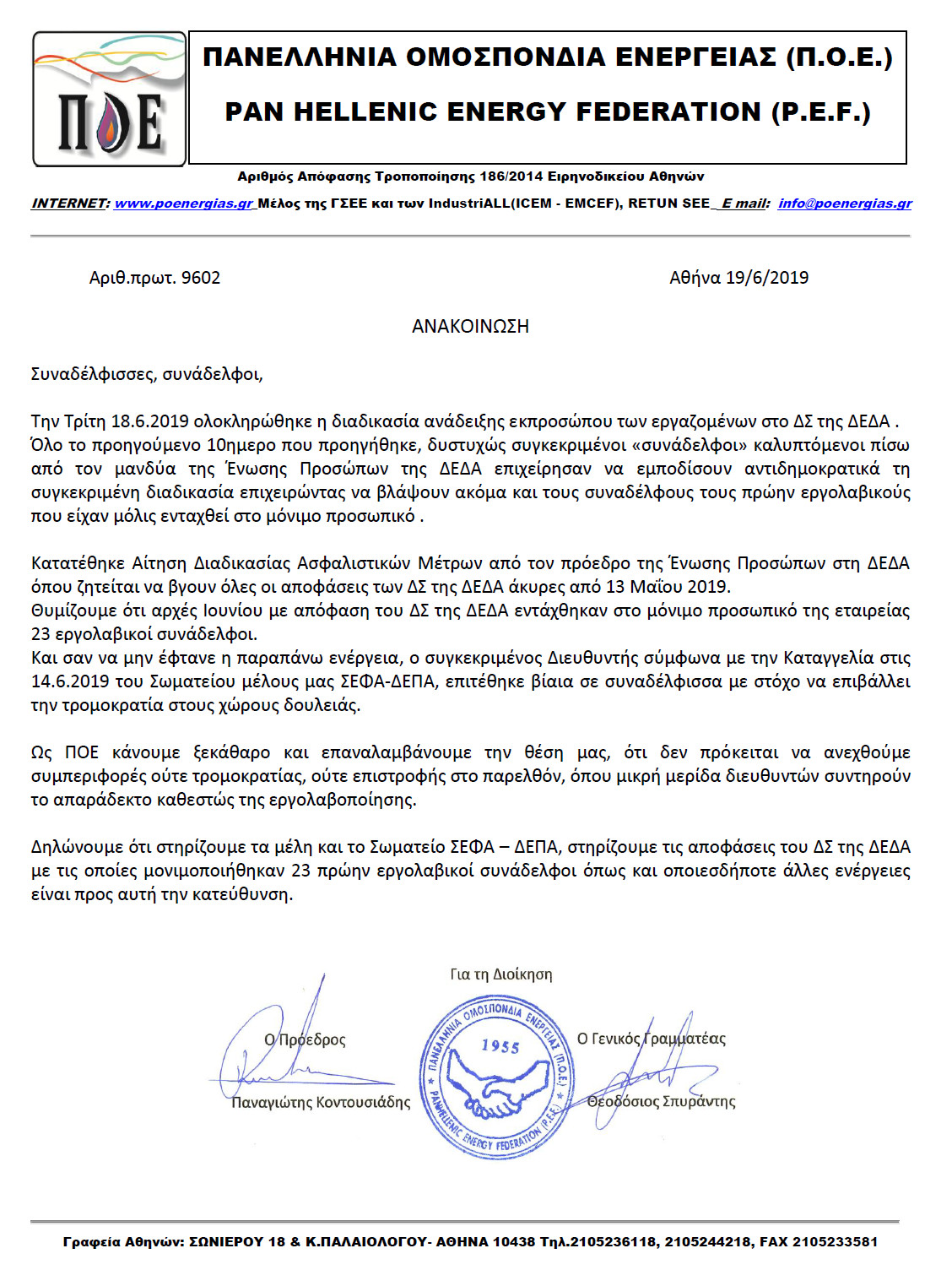 Καλούμε όλα τα σωματεία μέλη του ΕΚΑ να καταδικάσουν απερίφραστα και κατηγορηματικά τη διευθυντική βία στους χώρους εργασίας. Καλούμε τους εργαζόμενους και τα σωματεία του ομίλου ΔΕΠΑ να σπάσουν το πέπλο της σιωπής και να διεκδικήσουν δημόσια και θαρραλέα το δίκιο τους.